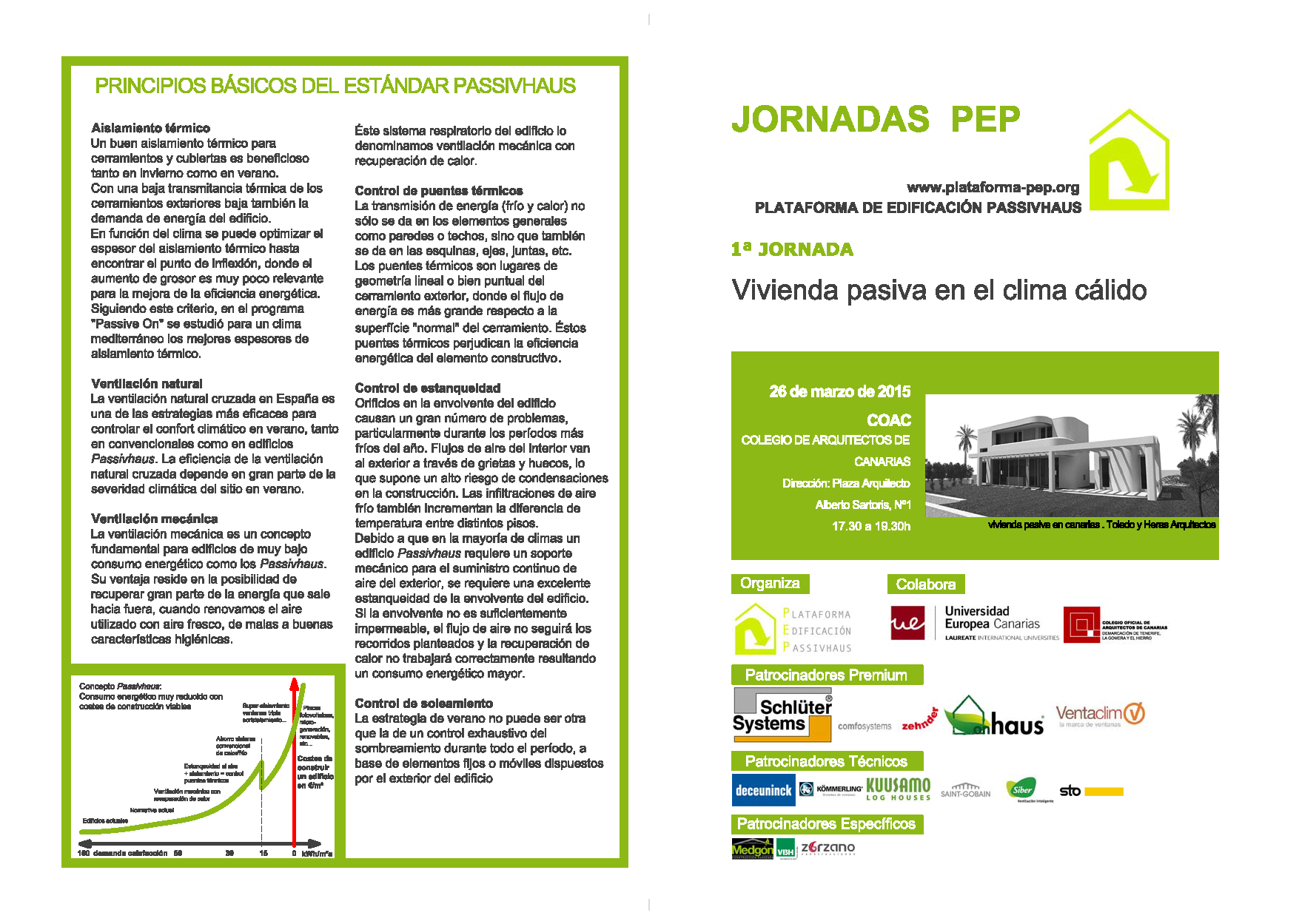 El pasado 26 de marzo la Plataforma de Edificación Passivhaus – PEP organizó, en colaboración con la Universidad Europea y el Colegio Oficial de Arquitectos de Canarias, una jornada denominada “Vivienda Pasiva en el clima cálido” en Santa Cruz de Tenerife.