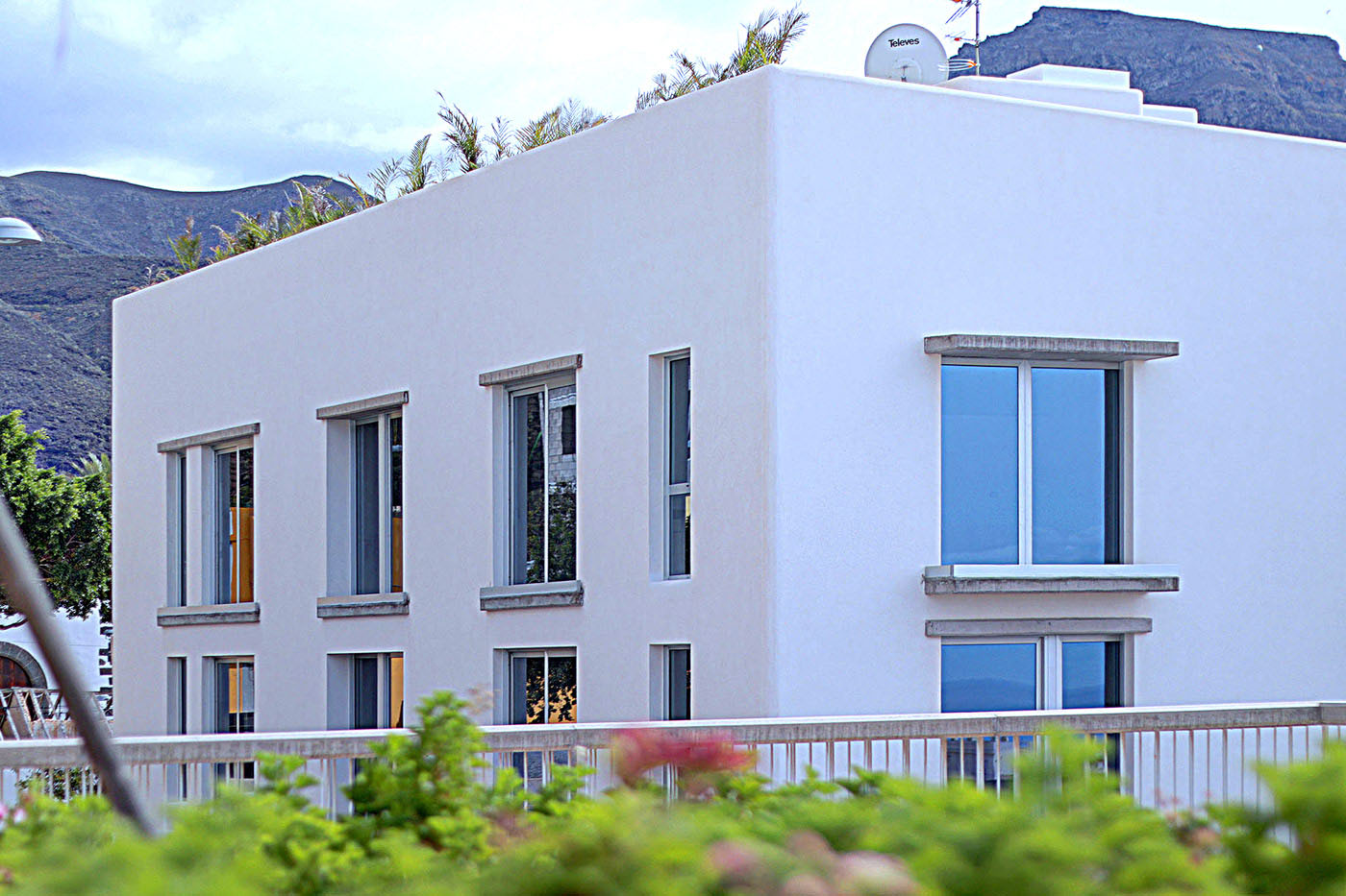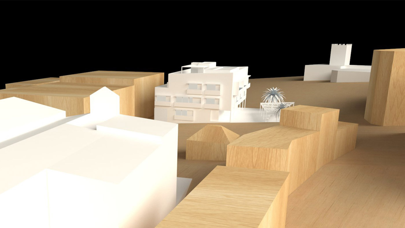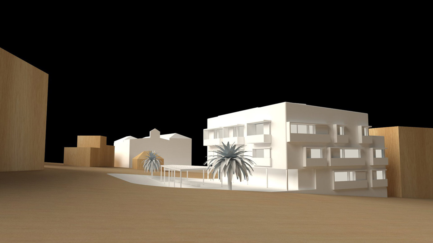 Proyectamos este edificio de consumo casi nulo segun CTE (A) de cuatro plantas para quince viviendas y locales, junto al barranco del Infierno, en el entorno urbano la iglesia de Santa Úrsula y el Conjunto Histórico de Casa Fuerte, siguiendo los parámetros de edificación de consumo nulo y sostenible.